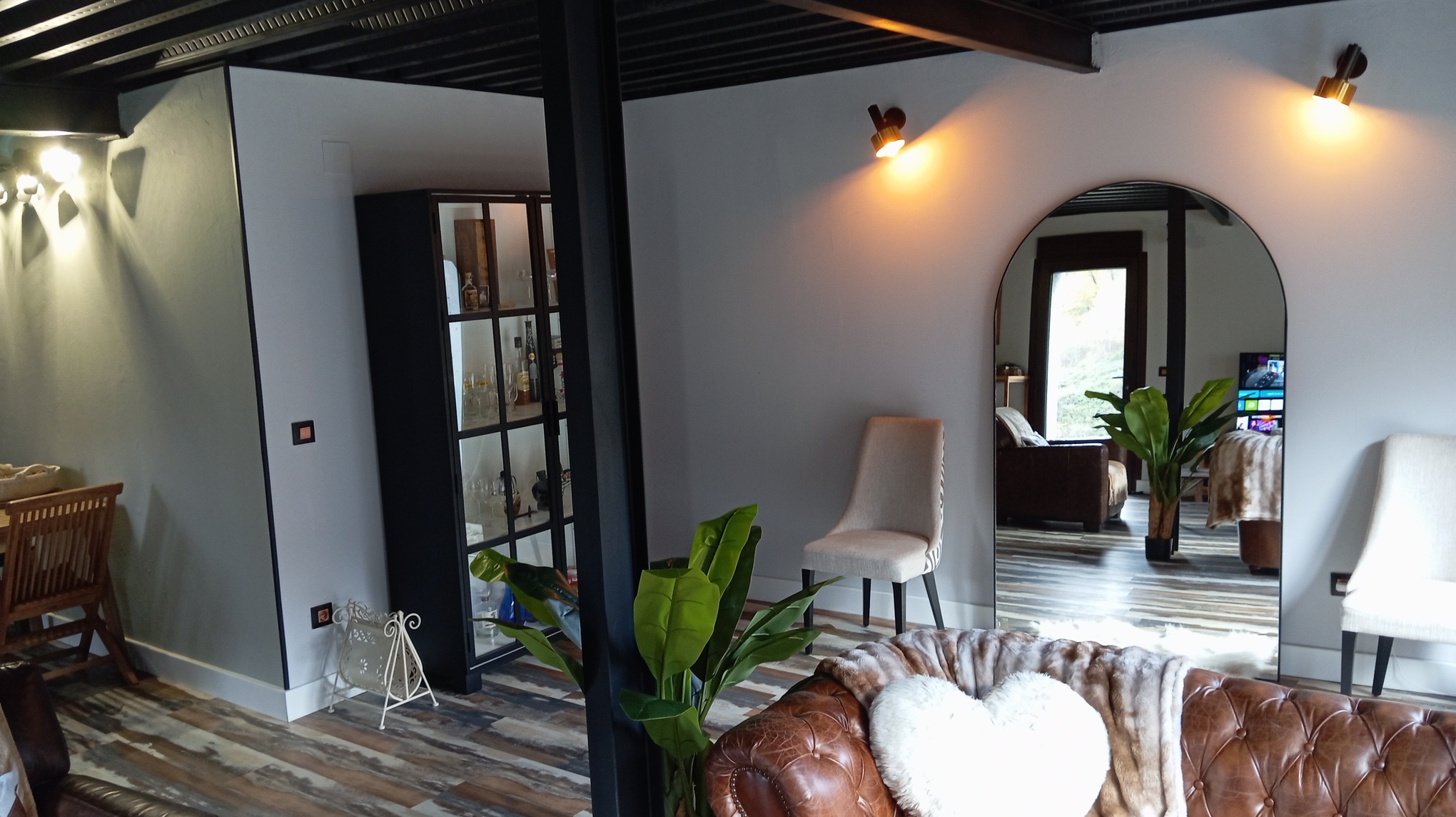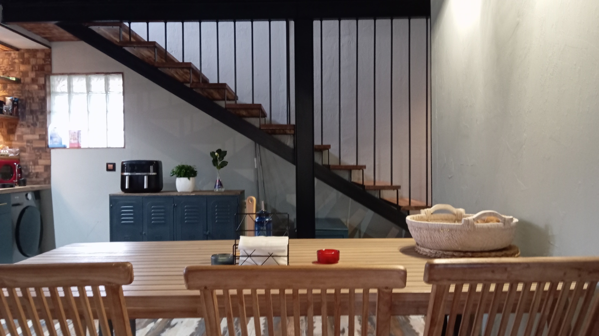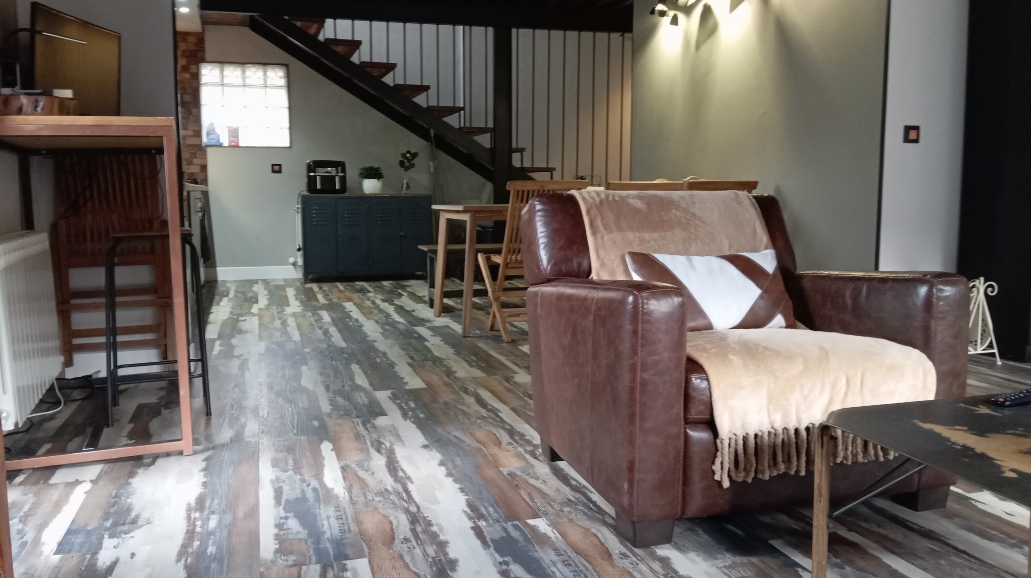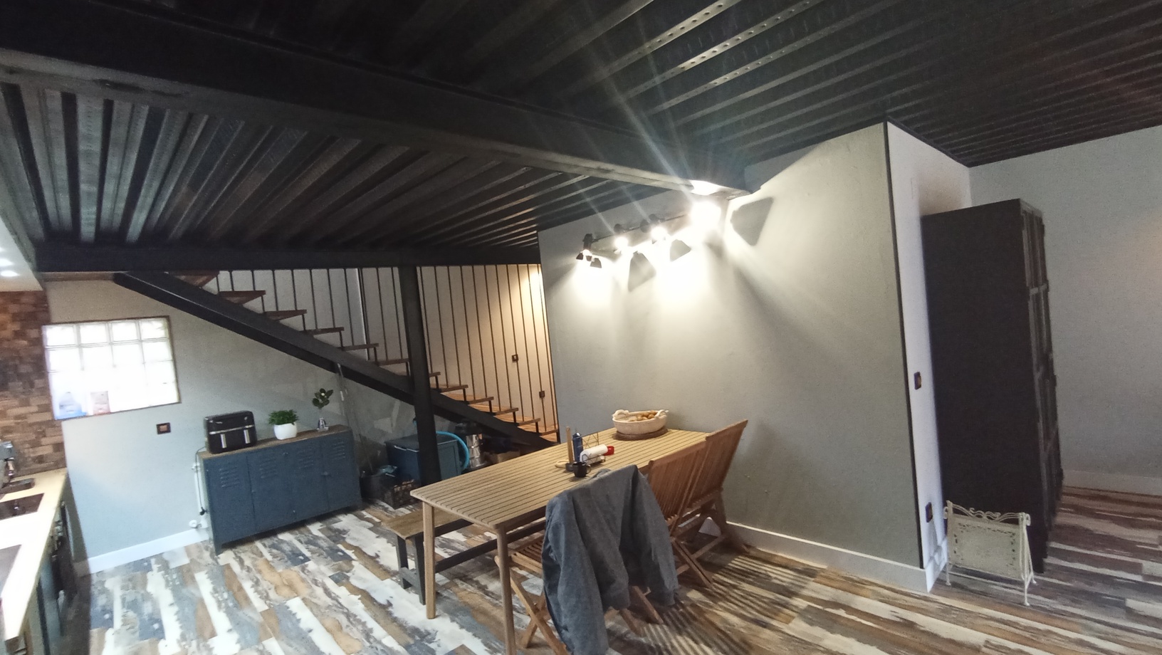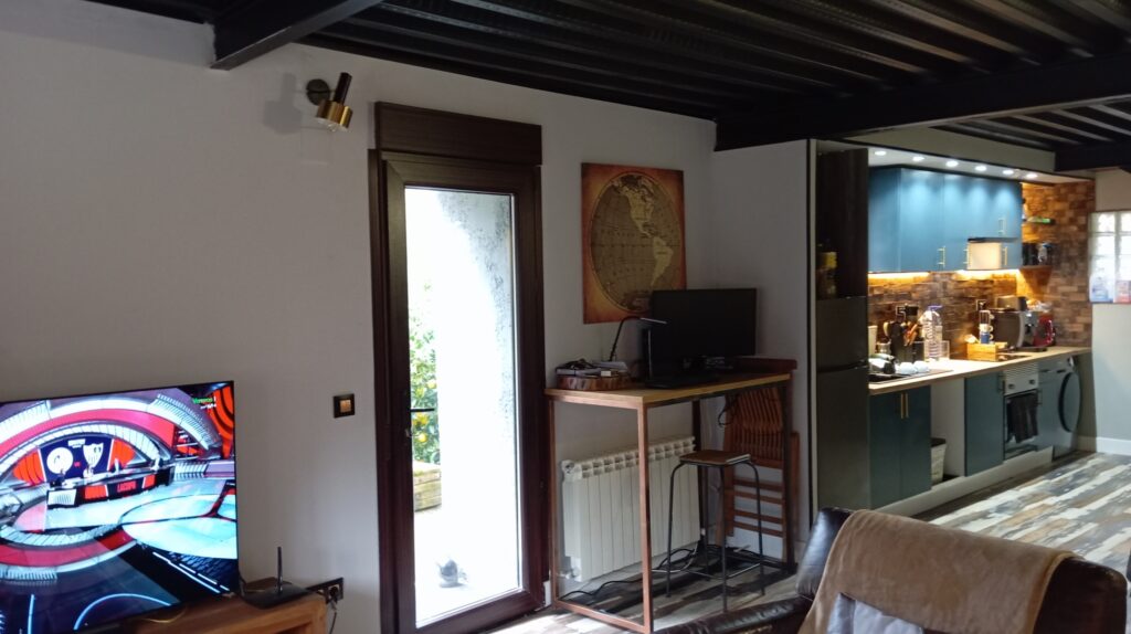Esta casa cuenta también, con un bajo cubierta o buhardilla, (35m2) totalmente reformada y funcional con calefacción de gasoil, salón con cocina americana, baño completo, y un dormitorio en altillo, area de lavandería, revestida en madera maciza y puerta de metal para espacios de almacenamiento o habitación, hecho a mano al estilo industrial vintage, con entrada independiente.